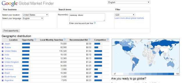 全球商機(jī)洞察可以提供來(lái)自全球互聯(lián)網(wǎng)搜索的數(shù)據(jù)。按照總的搜索量、建議出價(jià)和競(jìng)爭(zhēng)狀況對(duì)每個(gè)市場(chǎng)的商機(jī)進(jìn)行排序。