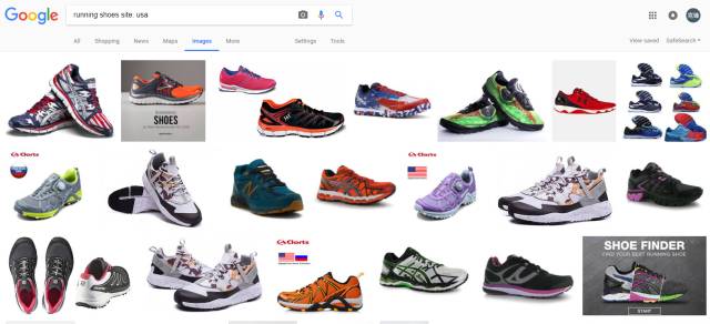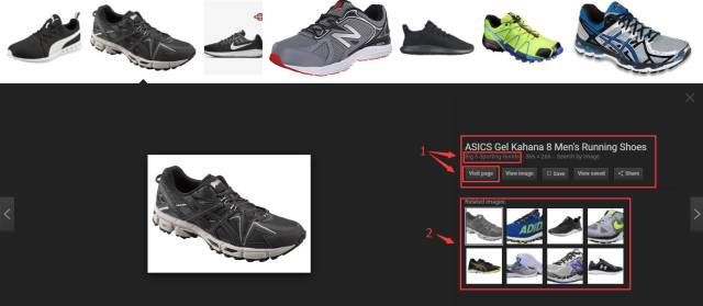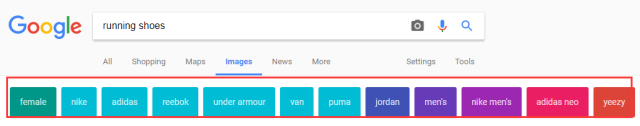 輸入“running shoes”,就會(huì)出現(xiàn)各種跑鞋,眼花繚亂。往下看在圖片結(jié)果的上端出現(xiàn)了一條不同顏色的單詞條,這是Google推薦的篩選細(xì)分類(lèi)目。