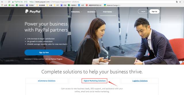 打開PayPal英文版官網(wǎng),在“Digital Marketing Solutions(營銷推廣)”中便可找到外貿(mào)牛的官網(wǎng)入口。未來雙方將在營銷推廣、市場優(yōu)化、用戶服務(wù)等多方面展開廣泛深入合作,為中國的廣大外貿(mào)企業(yè)構(gòu)建“出?!睒蛄骸?/span>