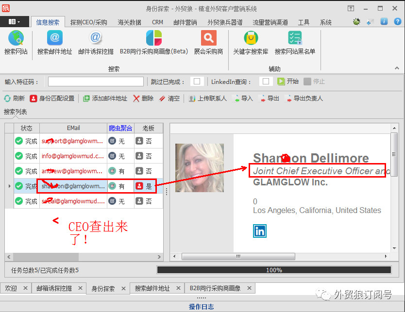 客戶希望以這個(gè)郵箱(c.hamel@glamglow.com )為線索去分析這家公司的采購或者老板的郵箱,而通過外貿(mào)狼,只能查的出來2個(gè)郵箱,而且無法分析身份信息。
