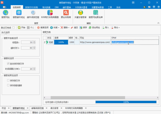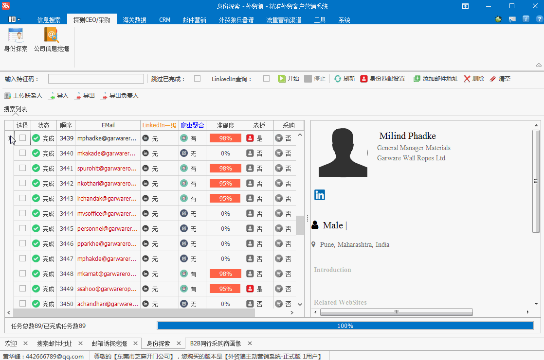 利用外貿(mào)狼的深度挖掘功能和搜索引擎爬蟲技術(shù),快速挖掘出企業(yè)的89個(gè)企業(yè)郵箱。